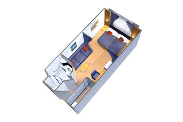 Size approx: 211 sq. ft. Have a spectacular view for a memorable vacation. Two twin beds that convert to a Royal King bed. One double sofa bed in staterooms with up to 4 guests. One bathroom.